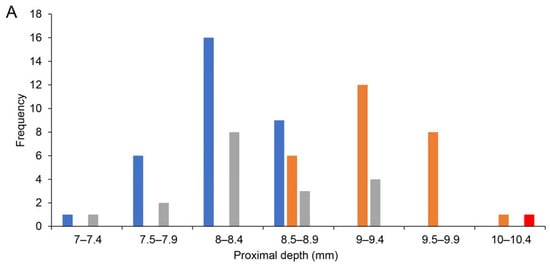 To test for different humeral proportions between taxa, we performed a correlation-based principal component analysis in Past 4.08 [7] (Figure 1C,D). Only humeri with all 6 measurements were included (see Appendix A). Additionally, we used frequency histograms of proximal depth and distal width to visualise sexual dimorphism (bimodal distribution) or the lack thereof (unimodal distribution) for both the fossils and Tadorna variegata (Figure 2).