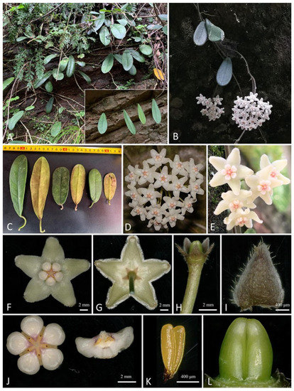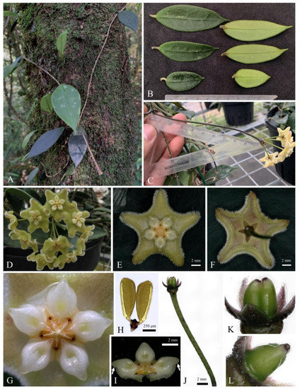 Taxonomic discussion.Hoya sichuanensis is morphologically similar to H. lyi Levl., a species widely distributed in China, Laos, and Vietnam [22]. Both H. sichuanensis and H. lyi exhibit the following traits: rooting stems, many-flowered axillary pseudumbels, corolla rotate, usually white in color, densely pubescent adaxially and glabrous abaxially, margin recurved, corona broadly ovate in top view, outer angle sub-truncate to broadly rounded, inner end acuminate. However, H. sichuanensis can be distinguished from the latter in having lamina usually obovate in shape (Figure 2A–C) (vs. oval to elliptic or oblong; Figure 3A,B), apex rounded and base cuneate or rarely rounded (Figure 2A–C) (vs. an apex that is usually acute and a base that is rounded; Figure 3A,B), petioles 1–3.5 cm long and approximately 3 mm in diameter (Figure 2C) (vs. 3–10 mm long and 1–1.5 mm in diameter; Figure 3A), calyx lobes triangular and approximately 1.6 mm wide at the base (Figure 2G–I) (vs. narrowly triangular; Figure 3E), corona white in color (Figure 2B,D–F,J) (vs. ivory white with a purple centre; Figure 3D,F,G).