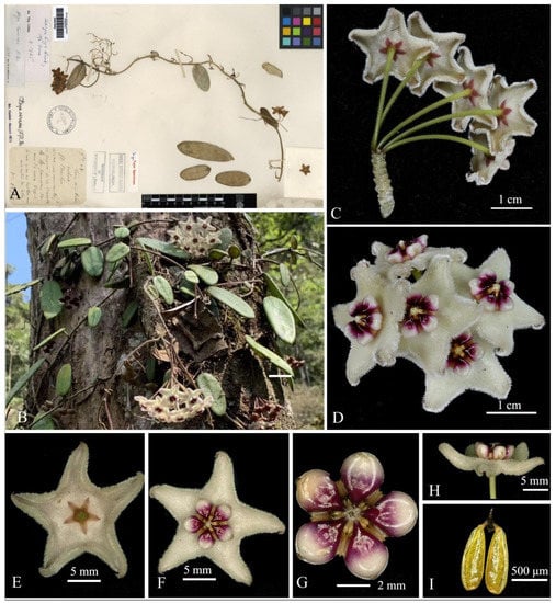 - Zuo, Y.W.; Lan, X.Z.; Deng, H.P.; Zhao, F.Y.; Yuan, X.F. Hoya nyingchiensis (Apocynaceae, Asclepiadoideae), a new species from Tibet, China. Phytotaxa 2020, 468, 130–136. [Google Scholar] [CrossRef]