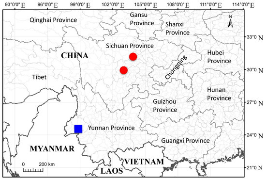 Distribution of Hoya longlingensis (blue square) and H. sichuanensis (red circular).