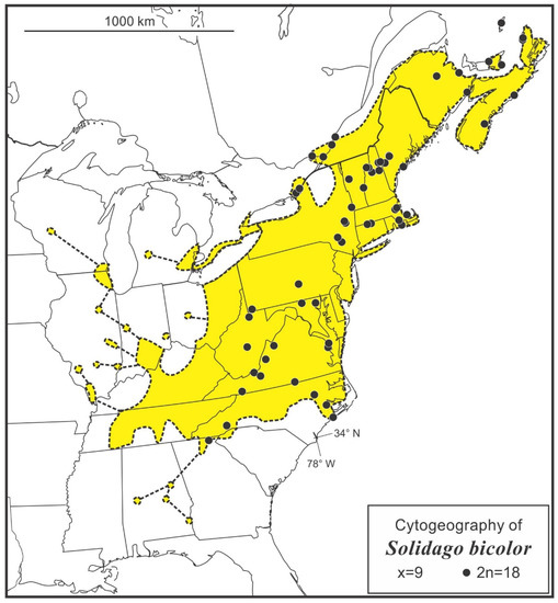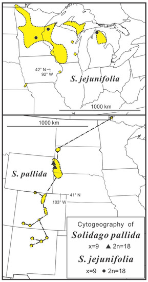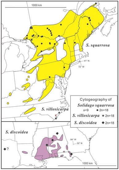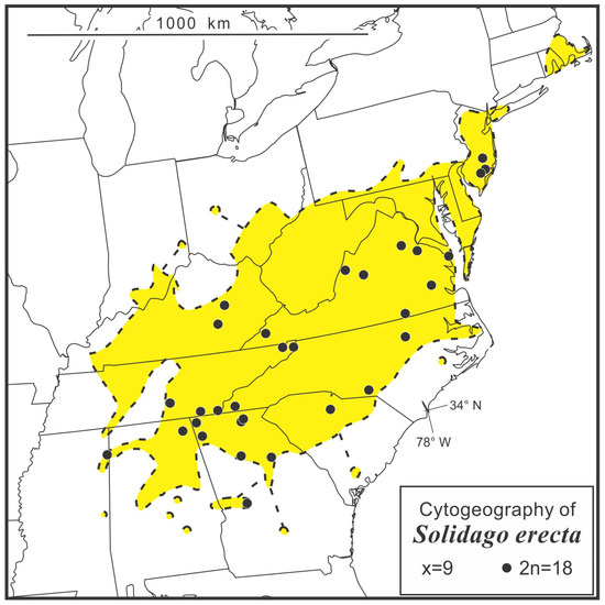 - Semple, J.C.; Ringius, G.S.; Leeder, C.; Morton, M. Chromosome numbers of goldenrods, Euthamia and Solidago (Compositae: Astereae). II. Additional counts with comments on cytogeography. Brittonia 1987, 36, 280–292, Addendum, Brintonia 1985, 37, 121. [Google Scholar] [CrossRef]