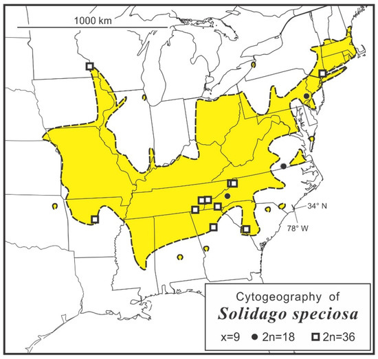 - Peirson, J.A.; Reznicek, A.A.; Semple, J.C. Polyploidy, speciation, and infraspecific cytotype variation in goldenrods: The cytogeography of Solidago subsection Humiles (Asteraceae: Astereae) in North America. Taxon 2012, 61, 197–210. [Google Scholar] [CrossRef]