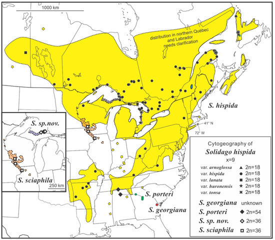The sizes of the ranges of species vary greatly in the genus Solidago as does the number of known populations within each range. Range size and frequency of occurrence within that range varies from very narrow and very rare, e.g., S. porteri (known only at the hexaploid level 2n = 54) and S. villosicarpa (known only at the diploid level 2n = 18), to relatively widely distributed and common, e.g., S. hispida (known only at the diploid level 2n = 18) and S. speciosa (known at both the diploid and tetraploids levels). The reasons for these differences are not known, although in some cases rare species appear to be found growing in rare habitats with distinct soil characteristics associated with particular communities of dominant plants, e.g., S. villosicarpa (LeBlond 2000 [43]). Semple and Cook [3] included comments on habitats of all species discussed below.