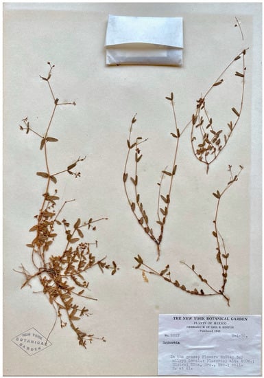 - Thiers, B. New York Botanical Garden’s Virtual Herbarium. Index Herbariorum: A Global Directory of Public Herbaria and Associated Staff. 2022. Available online: http://sweetgum.nybg.org/science/ih/ (accessed on 30 April 2022).