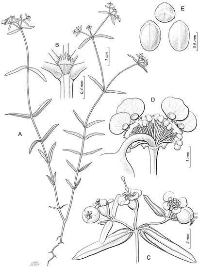 - Yang, Y.; Riina, R.; Morawetz, J.J.; Haevermans, T.; Aubriot, X.; Berry, P.E. Molecular phylogenetics and classification of Euphorbia subgenus Chamaesyce (Euphorbiaceae). Taxon 2012, 61, 764–789. [Google Scholar] [CrossRef] [Green Version]