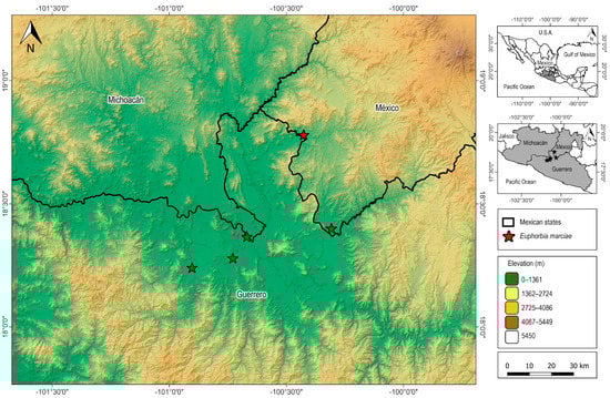 Euphorbia marciae is endemic to the lowlands of the Balsas Depression of southern Mexico (Figure 3). It is known from northwestern Guerrero and the extreme southwestern portion of the state of México, at elevations from 250 to 610 m. It likely also occurs in southeastern Michoacán, because one collection was made just across the border in Guerrero, and the extrapolated extent of occurrence (EOO) includes a portion of Michoacán. The vegetation of this region is dominated by tropical deciduous forest, following Rzedowski [10], and there is a pronounced dry season with little rain from November to May. The Hinton collections describe the habitat as “llano” or “in the grass,” almost certainly referring to the grassy openings that often occur naturally on rocky substrates within the tropical deciduous forest. The Diaz & Vargas specimen states that plants were found in pastures, and the Matuda et al. sheet says a humid hillside with low scrub. Flowering and fruiting overlap, and reproductive plants have been gathered from July to September, but certainly extend into at least November.
