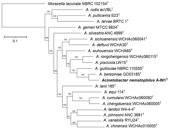 Bacterial strains were obtained from different soil-borne nematode strains isolated at different locations in Tunisia using the soil baiting method and different insects as baits [44] as described elsewhere [13]. This procedure was carried out to isolate entomophilic nematodes. Acinetobacter nematophilus sp. nov. A-IN1T was isolated from an unidentified soil-borne nematode, IN1, collected in the National Agronomic Institute of Tunisia (Tunis, Tunisia). These nematodes were isolated using Galleria mellonella larvae as baits. Unfortunately, we were unsuccessful in establishing long-term nematode colonies under laboratory conditions, and we could not identify these nematodes. However, insects presented typical symptoms of Heterorhabditis nematode infestation such as that the nematodes turned red within 48 h upon nematode inoculation. Alcaligenes nematophilus sp. nov. A-TC2T and Kaistia nematophila sp. nov. K-TC2T were isolated from Oscheius tipulae TC2 nematodes collected in Takilsa (Cap Bon, Tunisia). These nematodes were isolated using Ceratitis capitata pupae as baits. Enterobacter nematophilus sp. nov. E-TC7T was isolated from Acrobeloides bodenheimeri TC7 nematodes collected in Takilsa (Cap Bon, Tunisia). These nematodes were isolated using Ceratitis capitata pupae as baits. To isolate the bacteria from O. tipulae TC2 and A. bodenheimeri TC7 nematodes, approximately 200 specimens of each nematode strain were washed several times with sterile phosphate buffered saline (PBS, 1mM KH2PO4, 1mM K2HPO4, 5M NaCl, pH 7.2). Then, the nematodes were incubated in a 1% v/v sodium hypochlorite/PBS solution for 5 min under gentle orbital agitation. After this incubation period, the nematodes were recovered by decanting, washed with sterile PBS, and incubated again in a 1% v/v sodium hypochlorite/PBS solution. After this incubation period, the nematodes were again recovered by decanting, washed several times with PBS and sonicated in sterile PBS at 4 °C for 30 sec and at 100W burst using an ultrasonic processor (Labsonic-L, B-Braun Biotech Inc, Allentown, PA, USA). The nematode body fragments were pelleted by centrifugation at 650× g (10 min, 4 °C). Then, 100 µL of supernatants were cultured in lysogeny broth (LB) medium overnight at 30 °C under constant shaking (180 rpm). An aliquot of the resulting cultures was plated on LB agar medium and incubated at 30 °C for 24–48 h. Single colonies were sub-cultured and used for further experiments. To isolate the bacteria from IN1 nematodes, a few drops of hemolymph from G. mellonella larvae infested with these nematodes were cultured in LB medium. To this end, the larvae were dipped first in 70% ethanol, and then punctured with a sterile needle in the ventral part. The released hemolymph was cultured in LB medium and incubated overnight at 30 °C for 24 h under constant shaking (180 rpm). An aliquot of the resulting cultures was plated on LB agar medium and incubated at 30 °C for 24–48 h. Single colonies were sub-cultured and used for further experiments. Different procedures such as the characterization of colony and cell morphology, and 16S rRNA gene sequencing were carried out to determine culture purity. The bacteria were deposited in the Czech Collection of Microorganisms (CCM) and in the national Culture Collection of Switzerland (CCOS) under the following accession numbers: Acinetobacter nematophilus A-IN1T (=CCM 9231T =CCOS 2018T), Alcaligenes nematophilus A-TC2T (=CCM 9230T =CCOS 2017T), Enterobacter nematophilus E-TC7T (=CCM 9232T =CCOS 2020T), and Kaistia nematophila K-TC2T (=CCM 9239T =CCOS 2022T).