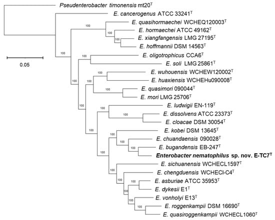 Phylogenetic reconstructions based on 16S rRNA gene sequences show that E-TC7T is more closely related to Enterobacter bugandensis EB-247T (Figure S3A). The 16S rRNA gene sequence similarity score between E-TC7T and this strain is 99.5% (Figure S3B). Based on phylogenies reconstructed from core-genome and core-proteomes, E-TC7T is more closely related to E. bugandensis EB-247T (Figure 3 and Figure S5C). Similar phylogenies were reconstructed in previous studies [34,36]. The digital DNA-DNA hybridization (dDDH) score between E-TC7T and this strain is 63.7% (Table 3). These values are below the 70% divergence threshold for prokaryotic species delineation [70,72,76].