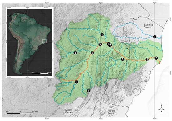 The Rio Doce basin is located in Brazil between the states of Minas Gerais and Espirito Santo and is part of the Southeast Atlantic watershed. It is Brazil’s fifth largest basin, with a drainage area of approximately 83,400 km2 [20]. The Rio Doce basin was strongly impacted by iron ore tailings after the Fundão dam collapse in 2015, releasing roughly 50 million m3 of tailings into the river system [21,22]. This mudflow traveled more than 650 km before reaching the Atlantic Ocean [23,24]. It is regarded as one of Brazil’s worst environmental disasters [25,26].