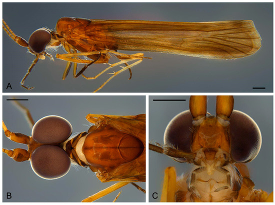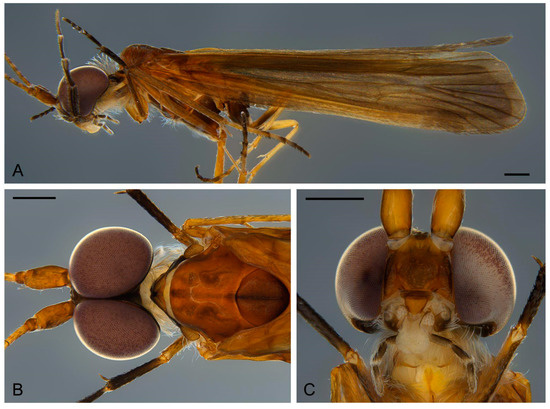 Figure 2. Marilia aranan sp. nov.: (A) Habitus, lateral; (B) Head and thorax, dorsal; (C) Head, ventral. Scale bar: 0.5 mm.