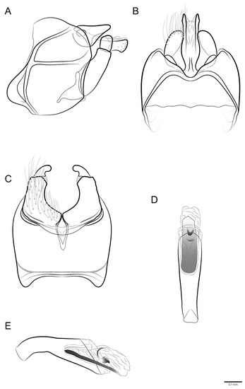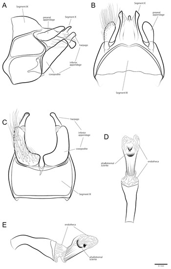 Male genitalia (Figure 13A–E): Segment IX, in lateral view, anterior margin nearly straight, posterior margin strongly projected dorsally and mesally; with midlateral suture separating each side of segment IX into two subequal parts, dorsal part partially divided (Figure 13A); in dorsal view, anterior margin straight, posterior margin concave, without sutures, lateroapical corner weakly produced (Figure 13B); in ventral view, anterolateral corner without projection, delimited by suture, anterior margin nearly straight, posterior margin concave. Preanal appendage, in lateral view, short, shorter than segment X, deltoid, tapering apically, apex acute (Figure 13A); in dorsal view, clavate, wider apically (Figure 13B). Segment X, in lateral view, wider at base, narrowing towards apex, apex rounded, without projections, dorsal margin nearly straight (Figure 13A); in dorsal view, wider at base, narrowing towards apex, sclerotized, each side with subapical angle, apex rounded, mesally sclerotized, apex with shallow V-shaped incision (Figure 13B). Inferior appendage bi-articulated: in lateral view, coxopodite cylindrical with base broader than apex, darkly sclerotized; in ventral view, without basomesal lobe (Figure 13C); harpago short in lateral view, about 5× shorter than coxopodite, with small conical spines apically (Figure 13A); in ventral view, nearly straight (Figure 13C). Phallus tubular slightly curved near base in lateral view (Figure 13E); straight in ventral view with subapical constriction (Figure 13D); endotheca membranous; in lateral view, phallotremal sclerite with rounded dorsal structure, C-shaped mesal structure and oblong ventral structure (Figure 13E).
