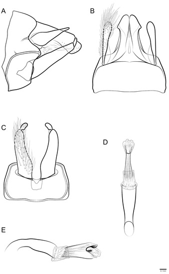 Male genitalia (Figure 4A–E): Segment IX, in lateral view with anterior margin slightly projected subventrally, posterior margin projected dorsally and mesally, with sutures separating each side of segment IX into three subequal parts (Figure 4A); in dorsal view, anterior margin straight, membranous, posterior margin with concave suture, lateroapical corners weakly produced (Figure 4B); in ventral view, segment IX not separated by suture, anterior margin straight, posterior margin concave. Preanal appendage, in lateral view, shorter than segment X, wider sub-basally, slightly tapering apically, apex rounded (Figure 4A); in dorsal view, clavate, with numerous setae and base, narrower than apex (Figure 4B). Segment X, in lateral view, wider at base and narrowing at apex, ventral margin straight, apex rounded, dorsal margin with long, narrow, digitate projection (Figure 4A); in dorsal view, wider at base, narrowing subapically, sclerotized laterally, each side with strong subapical angle and acute apex, membranous mesally with small subapical sclerotized lobe (Figure 4B). Inferior appendage bi-articulated: in lateral view, coxopodite cylindrical with base broader than apex (Figure 4A); in ventral view, with basomesal lobe forming strong angle (Figure 4C); harpago short in lateral view, about 3× shorter than coxopodite, with small conical spines apically (Figure 4A); in ventral view, nearly straight (Figure 4C). Phallus tubular slightly curved near base in lateral view (Figure 4E), straight in ventral view (Figure 4D); endotheca membranous with subtle small spines; in lateral view, phallotremal sclerite with C-shaped dorsal structure and tube-shaped ventral structure (Figure 4E).