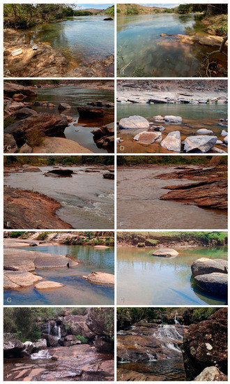 Collection sites at the tributaries in Minas Gerais: (A,B) Rio Doce, Piranga river; (C,D) Ferros, Santo Antônio river; (E,F) Matias Lobato, Suaçuí Grande river; (G,H) Aimorés, Manhuaçu river; (I,J) Araponga, Pousada Fazenda do Remanso.