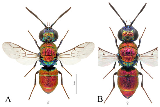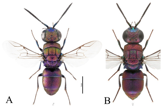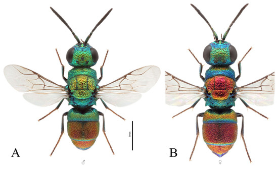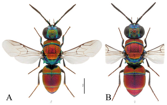 Chrysis pumilio Balthasar, 1953, habitus in dorsal view. (A) Male; (B) female.