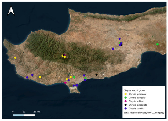 Three of the five species known for the Cypriot fauna are endemic: C. ignigena, C. ignescoa and C. kalliroi sp. nov. (the collecting site is shown in Figure 10; the distribution map of species of the leachii group is shown in Figure 11). The reason for this high rate of endemism should be further investigated, beginning research on their hosts. Of the other two species, C. pumilio is known from other eastern Mediterranean localities, such as Rhodes, Turkey [8], and Palestine [30], whereas C. lanceolata was originally described from southern Russia and is apparently spreading its distributional range from Eastern into Western Europe [37].