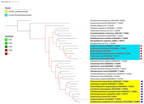 - Saddler, G.; Bradbury, J. Family I. Xanthomonadaceae. In Bergey’s Manual of Systematic Bacteriology, Volume 2 (The Proteobacteria), Part B (The Gammaproteobacteria); Springer: Berlin/Heidelberg, Germany, 2005. [Google Scholar]