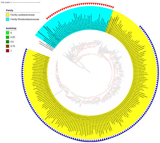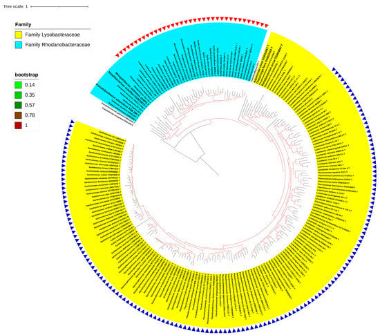 PhyloPhlAn of type strains. PhyloPhlAn tree depicting 213 Type strains, with Pseudomonas aeruginosa DSM 50071 00668T serving as an outgroup. Yellow shade represents the Lysobacteraceae family, with blue triangles representing the proposed species belonging to the genus Xanthomonas. The Rhodanobacteraceae family is represented by the sky-blue hue, while the proposed species belonging to the genus Rhodanobacter are represented by the red triangles. The bootstrap values are displayed as numbers with color branches.