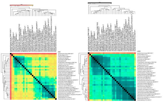 Accordingly, we used an overall genomic relatedness index (OGRI) for all the type/representative species representing different genera and families of the order. Here, according to the average amino acid identity (AAI) and core average amino acid identity (cAAI) cut-off values of 65% used for delineating a novel genus, the genus boundary for Xanthomonas is extended to include eight genera in total (Figure 4 and Figure 5). As indicated earlier, four of these genera were already reported to be synonyms in an earlier in-depth phylo-taxonogenomic study [30]. Here, according to the genus cut-off, all eight of these genera are synonyms of the genus Xanthomonas. The 65% AAI threshold also correlates with the whole-genome-based phylogenies, as these genera, with their constituent member species, form a distinct phylogroup within the family (constituent members are indicated by the bold font in the phylogenomic tree) (Figure 1, Figure 2 and Figure 3). When selecting a cut-off, it is important that the resulting genera be monophyletic [33,34]. Since the evolutionary history of these organisms is unobservable, we relied on sequence similarity and other computational metrics as proxies for evolutionary relationships. Accordingly, the various phylogenies that we present (Figure 1, Figure 2 and Figure 3) contain clade structures that are consistent with our proposed newly reorganized genera [36,57]. Similarly, according to the genus level cut-off for AAI and cAAI, the genus Rhodanobacter includes five more genera, Aerosticca, Fulvimonas, Dyella, Luteibacter, and Frateuria, that correspond to the sub-lineage identified within the family Rhodanobacteracea (Figure 4 and Figure 5). In this case, too, the 65% AAI threshold also correlates with the whole-genome-based phylogenies, as these genera, with their constituent member species, form a distinct phylogroup within the family (constituent members are indicated by the bold font in the phylogenomic tree) (Figure 1, Figure 2 and Figure 3). Even though it is reported that the vast majority of bacterial intra-genus AAI values are higher than 68%, for a particular or proposed genus under study, the threshold should pass the test of monophyly. Hence, by first establishing the monophyletic nature of the clade or group through deep genome-based phylogenetic trees using two different software (Figure 1, Figure 2 and Figure 3) and inspecting the AAI of the values (Figure 4 and Figure 5), in the case of Xanthomonas and Frateuria, we found that the cAAI and AAI cut-off 68% is also applicable to a large number of member species. Hence, considering monophyly test, we propose a cAAI and AAI cut-off of 65% as a threshold in the case of the genera Xanthomonas and Frateuria.