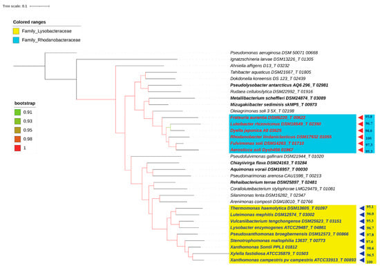 Based on the previous results, we propose moving the genera Aquimonas Saha et al. 2005 [44], Chiayiivirga Hsu et al. 2013 [45], and Rehaibacterium Yu et al. 2013 [46] from the family Rhodanobacteraceae to the family Lysobacteraceae and reshuffling Mizugakiibacter Kojima et al. 2014 [47], Metallibacterium Ziegler et al. 2013 [48], and Pseudolysobacter Wei et al. 2020 [49] from the family Lysobacteraceae to the family Rhodanobacteraceae. These member genera of this family were identified through the deep order-level phylo-taxonogenomic analysis in this study.