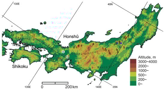 Subgenus Falcinebria Ledoux and Roux, 2005 is a flightless group belonging to carabid genus Nebria Latreille, 1802 that occurs in Japan, Taiwan, and mainland China [,,]. In Japan, two species, i.e., N. reflexa Bates, 1883 and N. taketoi Habu, 1962, have been recognized for several decades [,,,,], but these species were recently found to be composed of at least 11 and 2 species, respectively, based on comparative morphological analysis of the endophallus, a membranous inner sac everted from the aedeagus of the male genitalia [,,,,]. The utility of this male genital morphology in species-level taxonomy has been demonstrated in many Nebria taxa [,,,,]. There are, however, many localities from which specimens have not been examined (Figure 1; fig. 1 in []), and the overall diversity of this group has not been fully elucidated.