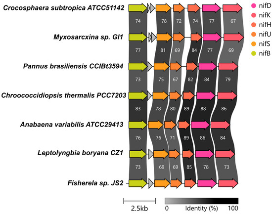 Synteny analysis showing the nifHDK and nifBSU operon in Pannus brasiliensis CCIBt3594 genome and the most related sequences in the database.