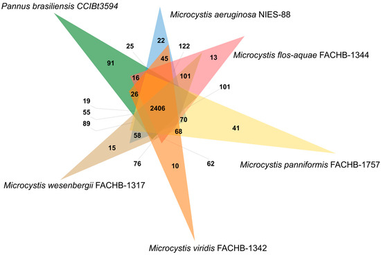 Assessing homological relationships between sequences has considerable meaning in genome annotation and phylogenetic inference. In the orthology analyses, when considering the genomes of five Microcystis sp. and the genome of P. brasiliensis, 2406 clusters of orthologous genes were identified. This set represents the core genome shared between the species, and the large number of shared genes suggests a common evolutionary history with conserved functions between the genera (Figure 3). These analyses aid in discerning whether a pair of homologous genes are orthologues (speciation) or paralogs (gene duplication) [113]. The stable core is a collection of genes characterized by comparable evolutionary trajectories exhibiting high conservation. This core encompasses genes responsible for main metabolic functions and the ribosomal apparatus, and it is resistant to horizontal gene transfer (HGT) events [24].