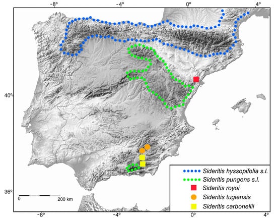 Finally, the morphological relationships with species belonging to S. subsect. Fruticulosae Obón & D.Rivera seem to be remote. It was suggested that the plants now described as S. royoi might be the result of introgression with S. spinulosa Barnades ex Asso [7] because of the presence of subespinescent upper leaves in S. royoi. Although this genus is very rich in hybrids and hybrid swarms in the Iberian Peninsula [23,24,25,26], our results indicate that the morphological differences between S. spinulosa and S. royoi are notable, allowing for a clear separation between those two species. Sideritis spinulosa differs by having holotrichous hair covering the base of branchlets, leaves with scarce glands and abundant trichomes 1.5–2.0 mm long, cylindrical inflorescences with 3–15 verticillasters, the abaxial surface of its middle bracts with scarce glands and scarce abundant trichomes (0.5–1.5 mm long), and calyx with a continuous carpostegium. Another species of S. subsect. Fruticulosae occurring in the Port Massif but in lower areas (up to 750 m a.s.l. altitude) is S. fruticulosa Pourr. This species differs from S. royoi by having holotrichous hair covering the base of its branchlets, leaves with scarce glands and abundant trichomes 0.3–1.5 mm long, cylindrical inflorescences with 3–7 verticillasters, the abaxial surfaces of middle bracts with scarce glands and scarce abundant trichomes (1.0 mm long), and calyx with a continuous carpostegium. In a recent and detailed taxonomic revision of S. fruticulosa [27], four subspecies were recognised, but none of them come close to having the morphological characteristics of S. royoi. Interestingly, Roselló et al. [27], who were very sensitive to detecting small morphological variations and hybrids, indicate no morphological relationship or existence of hybrids with S. hyssopifolia. Further, we have not observed S. spinulosa or S. fruticulosa in the locations where S. royoi occurs. Finally, regarding the suggested possible hybrid origin, S. hyssopifolia is widespread in the northern part of the Iberian Peninsula, mainly in the Pyrenees [11,28], but the species is not known to originate from the Port Massif [6,28,29], and thus, no range overlap with S. royoi occurs (Figure 3). Further molecular and cytogenetic work will help to elucidate this point.