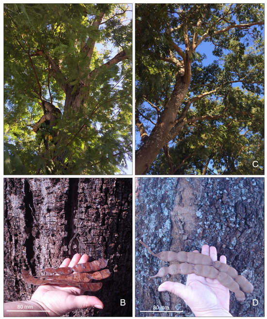 Leaves, trunks, and pods of the species Anadenanthera colubrina (A,B) and A. peregrina (C,D), observed in Acol BP (A,B) and Aper SP255 (C,D) angicals, Bonfim Paulista, district of Ribeirão Preto municipality, São Paulo State, southeastern Brazil. The most easily distinguishable characteristic of the two species is the integumentary surface of the pod. A. colubrina presents brightly colored fruits with smooth to cross-linked leaflets (B), while the fruits of A. peregrina are opaque and verrucous (D).