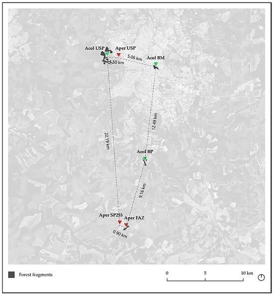 Aper USP/Aper FAZ populations that are located ~22 km apart showing the greatest genetic distance (6%), and Acol USP/Acol BP, located at a distance of ~14 km, presenting the lowest genetic distance (2.4%) (Table 3, Figure 2). Despite the short geographic distance (~5 km) between Acol USP/Acol BM (Figure 2), these populations showed a high genetic distance (5.7%), which is likely related to the urban isolation of the Acol BM population (Figure 2).
