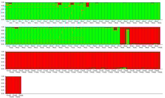 - Pritchard, J.K.; Stephens, M.; Donnelly, P. Inference of population structure using multilocus genotype data. Genetics 2000, 155, 945–959. Available online: http://www.genetics.org/content/genetics/155/2/945.full.pdf (accessed on 15 November 2022). [CrossRef]