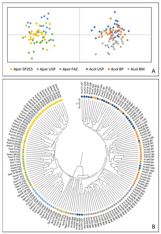 A similar percentage of polymorphic loci (mean = 82.87%) and number of de alleles (mean = 1.72%) were observed between the species. The Acol populations showed higher values of mean genetic diversity (h = 0.30) than Aper (h = 0.25; p < 0.05) (Table 4). The genetic diversity and number of alleles were significantly different among Aper populations (p < 0.05), with the highest values for Aper USP (h = 0.26) and Aper SP255 (NA = 1.84), respectively (Table 4).