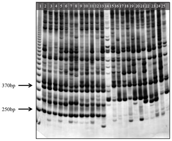 Electrophoresis amplification products obtained with ISSR UBC 2 on non-denaturing polyacrylamide gel. Channel 1 corresponds to the molecular weight marker 50 pb (GE Healthcare). Channels 2–13 and 14–25 correspond to the amplification products of Anadenanthera colubrina and A. peregrina DNA, respectively. Arrows indicate the potential species-specific ISSR bands present in A. colubrina and absent in A. peregrina.