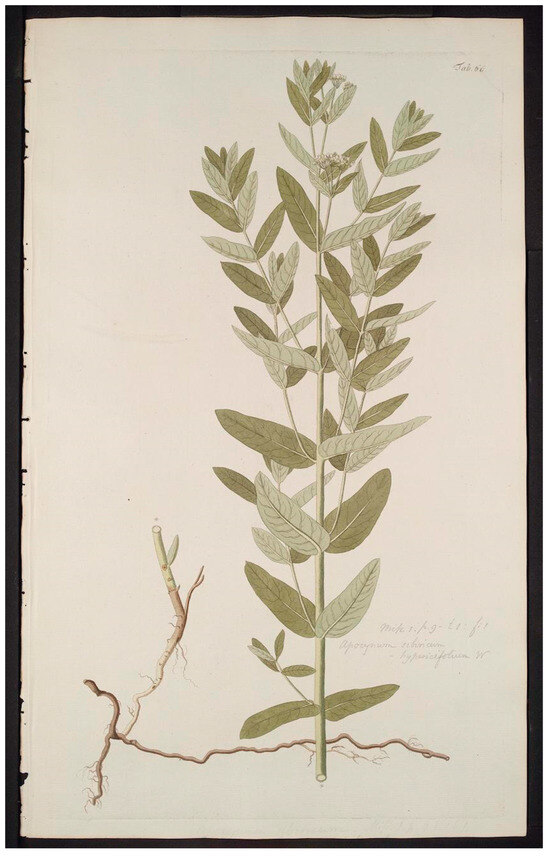 - Lemke, D.E. Apocynum. In Flora of North America North of Mexico; Editorial Committee, Ed.; 1993+. Flora of North America North of Mexico. 25+ vols; Oxford University Press: New York, NY, USA; Oxford, UK, 2023; Volume 14, pp. 138–140. [Google Scholar]