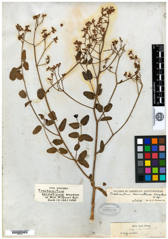 - Pobedimova, E.G. Genus Trachomitum Woodson. In Flora of the U.S.S.R.; Shishkin, B.K., Bobrov, E.G., Eds.; Soviet Academy of Science: Moscow, Russia; Leningrad, Russia, 1952; Volume 18, pp. 652–659. (In Russian) [Google Scholar]