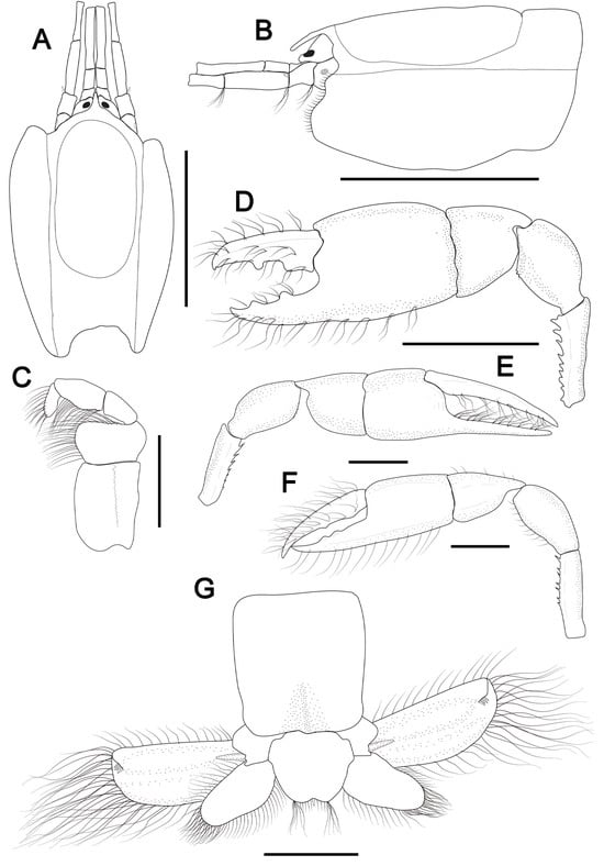 Cheramoides aff. marginata []. (A–G), male, cl 3.2 mm, MOUFPE 8413; I, female (cl: 3.6 mm), MOUFPE 21626. (A), carapace front, eyestalk and antennular and antennal peduncles, dorsal view; (B), same, lateral view; (C), left maxilliped 3, internal surface; (D,E), male major and minor chelipeds, respectively, lateral view; (F), female minor cheliped, lateral view; (G), sixth pleomere, uropods and telson, dorsal view. Scale bars: (A,B,D) = 2 mm; (C,E–G) = 1.0 mm.