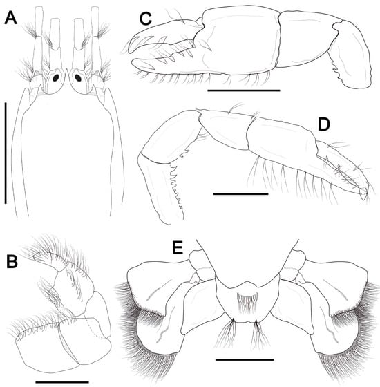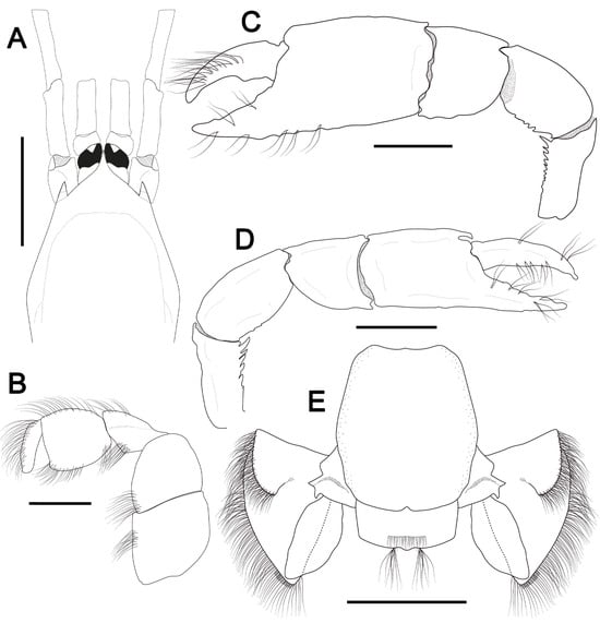 Corallianassa longiventris (A. Milne-Edwards, 1870) []. (A–C), female, cl 9.1 mm, MOUFPE 1880. (A), carapace front, eyestalk and antennular and antennal peduncles, dorsal view; (B), third maxilliped, external surface; (C,D), female major and minor cheliped, lateral view; (E), sixth abdominal somite, telson and uropods, dorsal view. Scale bars: (A,C,D) = 4 mm; (B,E) = 2 mm.
