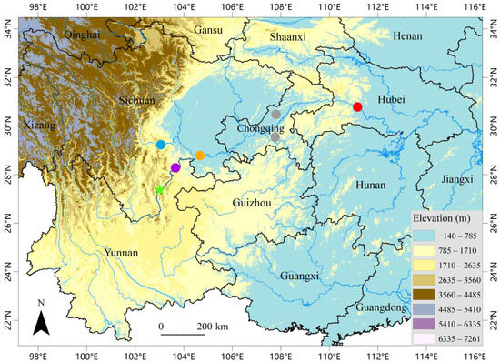 Diploderma splendidum (Barbour & Dunn, 1919) was originally described from the gorge of the Yangtze River (Changjiang River) near Ichang (Yichang City), Hupeh (Hubei Province), central China [17,18], and it was later considered to be widely distributed along the middle section of the Changjiang River, from Hubei Province to Chongqing Municipality, and Sichuan, Guizhou, and Yunnan provinces, as well as along the lower reach of the Dadu River in Sichuan Province [19,20,21,22,23,24]. Recently, Cai et al. [3] revised the D. splendidum complex, restricted the distribution of D. splendidum sensu stricto to around its type locality in Hubei Province and two possible introduced localities in Fujian Province and northeastern Sichuan Province only, and described the population previously considered to be D. splendidum from the Dadu River drainage basin as a new species, namely D. daduense Cai, Liu & Chang, 2024.