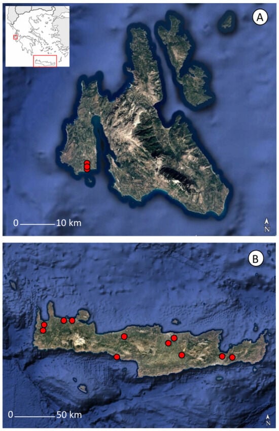 Distribution map of Solenopsis gutermannii from Kefalonia (A) and S. minuta from Crete (B) based on herbarium material (red dots).