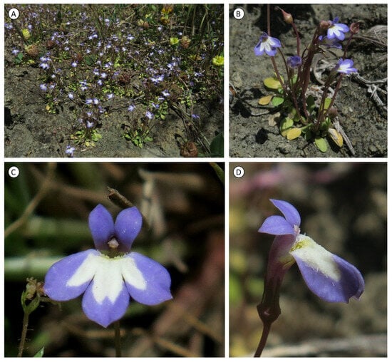Phenological features of Solenopsis gutermannii. (A) Natural habitat (Kefalonia). (B) Habit. (C) Flower (frontal view). (D) Flower (lateral view). Photos by S. Cambria.