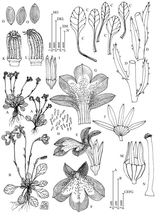 Solenopsis minuta from living plant sourced from Preveli Beach (Crete) collected by S. Cambria. (A) Habit; (B) Habit magnification (×2); (C) Leaves; (D) Bracteoles; (E) Flower (lateral view); (F) Flower (frontal view); (G) Open corolla; (H) Corolla papillae; (I) Calyx; (J) Open calyx; (K) Anthers (ventral view); (L) Anthers (lateral view); (M) Calyx with capsule; (N) Style and stigma; (O) Seeds. Drawing: S. Brullo.