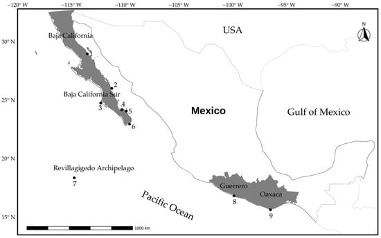 Study area in the Mexican Pacific indicating collection sites in Baja California, Baja California Sur, Revillagigedo Archipelago, Guerrero and Oaxaca. (1) Bahía de Los Ángeles; (2) Punta Esmeralda, Loreto; (3) Magdalena Island, Comondú; (4) La Gaviota Island, Balandra Beach and Calerita Beach, La Paz; (5) La Ventana Beach and Ensenada de Muertos, La Paz; (6) Palmilla Regina, Los Cabos; (7) Clarion Island, Revillagigedo Archipelago; (8) La Roqueta Island, Acapulco; (9) Agua Blanca Beach, Tonameca; Panteón Beach and Estacahuite Beach, Puerto Ángel; Tijera Beach and La Boquilla, San Pedro Pochutla and Santa Cruz Bay, Bahías de Huatulco. Map made with Natural Earth. Free vector and raster map data from website https://www.naturalearthdata.com/.