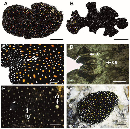 Diagnosis: Dorsal surface with a black background covered with irregular orange asterisk-shaped spots interspersed with yellow and white dots, along with numerous white microdots. White dots become more concentrated toward the margins and pseudotentacles. The ventral surface is black, scattered with white dots (Figure 2A,B).