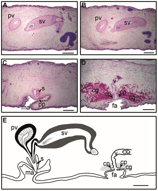Pseudobiceros deliae sp. nov. (A,B) Sagittal section of one male copulatory system showing seminal and prostatic vesicles. (C) Sagittal section of one male copulatory system showing stylet, penis papilla and male atrium. (D) Sagittal section of female copulatory system showing atrium, cement glands, cement pouches and vagina. (E) Diagrammatic reconstruction of sagittal view of one male and female copulatory systems. All scale bars = 300 μm. cg: cement glands, cp: cement pouches, fa: female atrium, ma: male atrium, pp: penis papilla, pv: prostatic vesicle, s: stylet, sv: seminal vesicle, v: vagina.