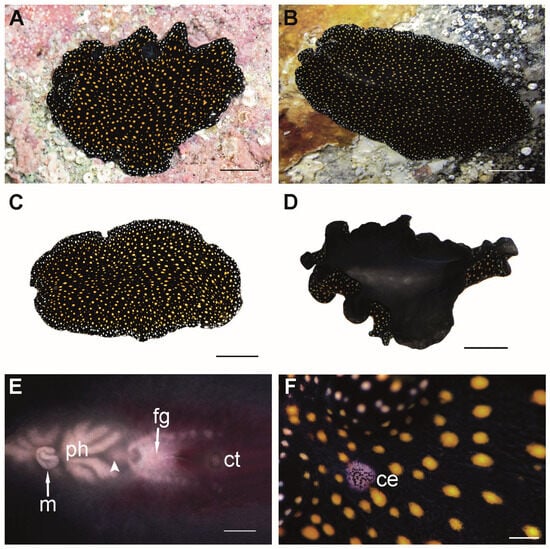 Description: Dorsal surface with a black background covered with numerous regular yellow spots of different sizes; margin delimited by white spots (Figure 4A–D), sometimes with tinges of yellow (Figure 4C,F). Ventral surface grayish-black without spots (Figure 4D,E). Pseudotentacles are simple folds of the margin. Cerebral eyes in horseshoe shape in a clear area with about 50 eyespots (Figure 4F). Two clusters of dorsal and ventral eyes on and between pseudotentacles. Pharynx with deep folds, butterfly shaped as typical for the genus (Figure 4E). Cotyl anterior to midbody (Figure 4D,E).