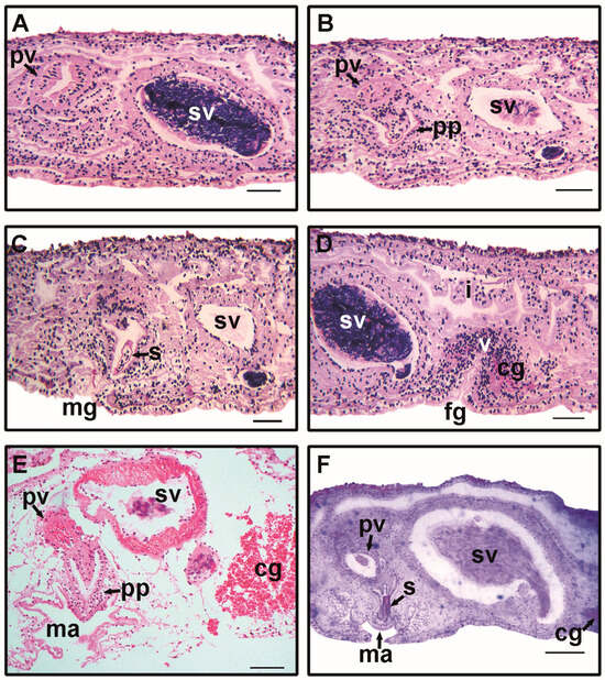 Pseudoceros josei. (A,B) Sagittal sections of male copulatory system, showing seminal vesicle, prostatic vesicle and penis papilla. (C) Sagittal section of male copulatory system showing stylet, seminal vesicle and male gonopore. (D) Sagittal section of female copulatory system, showing female gonopore, cement glands and vagina. (E) Male copulatory system of holotype followed posteriorly by cement glands of female reproductive system. (F) Sagittal section of male copulatory system of specimen from Oaxaca. All scale bars = 100 μm. cg: cement glands, fg: female gonopore, i: intestine, ma: male atrium, mg: male gonopore, pp: penis papilla, pv: prostatic vesicle, s: stylet, sv: seminal vesicle, v: vagina.