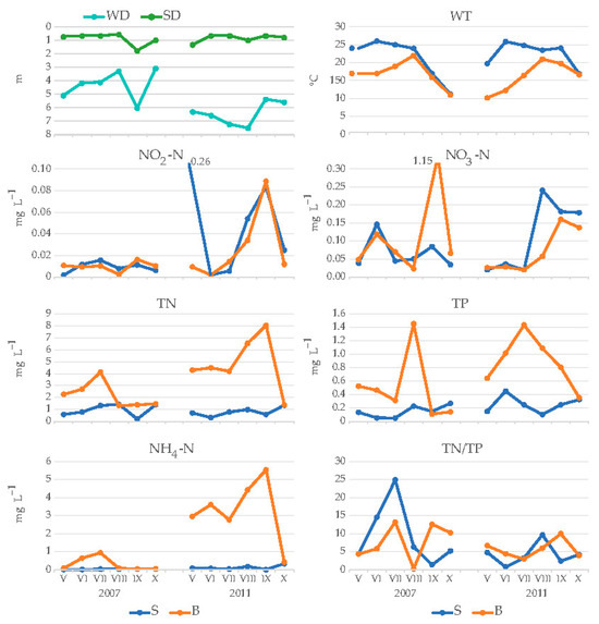 Values of physical and chemical properties of the water of Lake Sakadaš during the research period (2007 and 2011). Legend: surface (S), bottom (B), water depth (WD), transparency (SD), water temperature (WT), ammonium (NH4-N), nitrites (NO2-N), nitrates (NO3-N), total nitrogen (TN), total phosphorus (TP) and ratio of total nitrogen and total phosphorus (TN/TP).