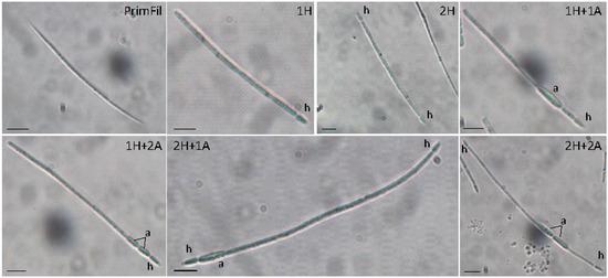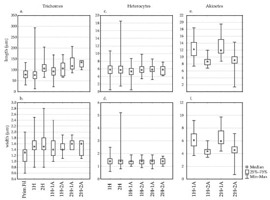 The median length of the trichomes was between 76 and 135.1 µm (Figure 2a), while the median width of the trichomes was between 1.3 µm and 1.6 µm (Figure 2b). Primary filaments and trichomes with one heterocyte had a lower median length than other trichomes. In addition, the median width of primary filaments was significantly smaller than that of other trichomes.