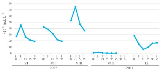The variation in abundance of R. raciborskii was in the range of 19.08 × 106 ind. L−1 (at 4 m in June)—74.64 × 106 ind. L−1 (at 1 m depth in August) in 2007 and from 0.07 × 106 ind. L−1 (at 3–5 m in August) to 27.81 × 106 ind. L−1 (at the surface in September) in 2011 (Figure 3). In general, the abundance of this species was higher in the upper layers than in the deeper layers of the water column. In 2007, R. raciborskii was found from the surface to the bottom but, at that time, the water depth was low (up to 4 m). In 2011, the water depth was greater (up to 7.5 m) and the studied species was not found at depths below 5 m.