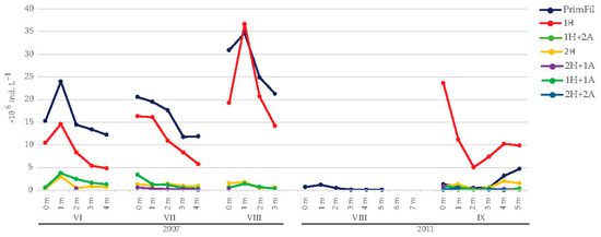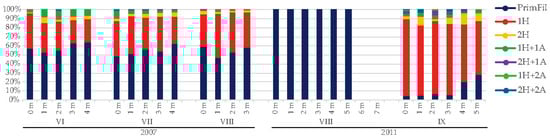 In 2011, at the beginning of development (August), only one morphological form (primary filament) of R. raciborskii was detected with a low number of individuals (0.07–1.21 × 106 ind. L−1) (Figure 5). This form was present from the surface to a depth of five meters. In September, a massive development of R. raciborskii was detected (27.81 × 106 ind. L−1 at the surface). In addition to the primary filament, there were six other morphological forms of secondary filaments. The predominant morphological form at all depths in September was the trichome with one heterocyte. Its abundance ranged from 5.02 × 106 to 23.60 × 106 ind. L−1. The higher relative abundance of this morphological form was found in the surface water layer, while a lower relative abundance was found in the bottom layer (Figure 6). The primary filament was also present in September, with a higher abundance at the bottom (4.72 × 106 ind. L−1). Other morphological forms occurred at all investigated depths but with a relative abundance of less than 12% (Figure 6).