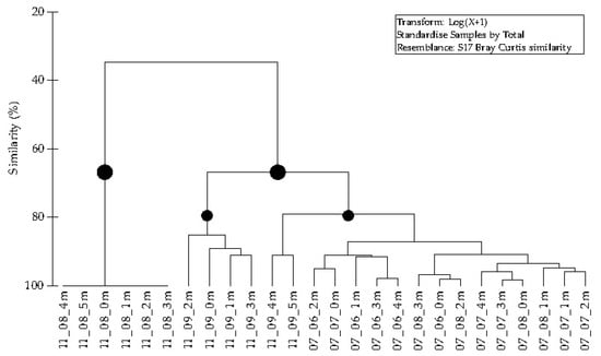 The hierarchical cluster analysis included data on the quantitative composition of the different morphological forms of R. raciborskii during the research period from June to August 2007 and August to September 2011 at Lake Sakadaš. The dendrogram (Figure 7) showed that the data were separated into two main groups, with a Bray–Curtis similarity of about 70%. The first group included samples from August 2011, at which time only the primary filament was developed without the secondary morphological forms of R. raciborskii. In the second group, there were two subgroups with a Bray–Curtis similarity of about 80%. The first subgroup contained samples from September 2011 to a depth of 4 m, when the predominant morphological form was the trichome with one heterocyte. The second subgroup included all samples from 2007 and samples from the bottom layer in September 2011, at which time the primary filament was significantly represented.